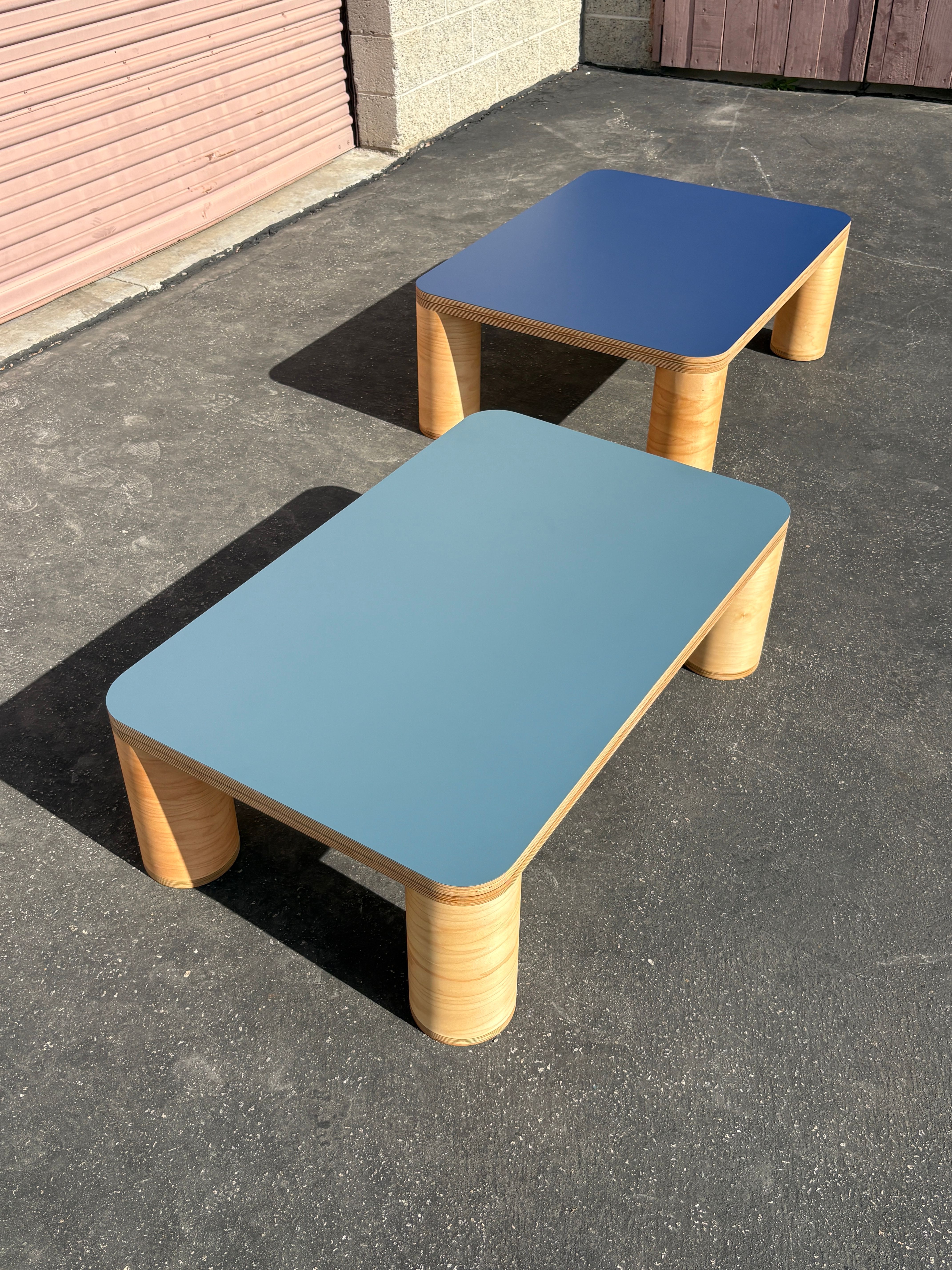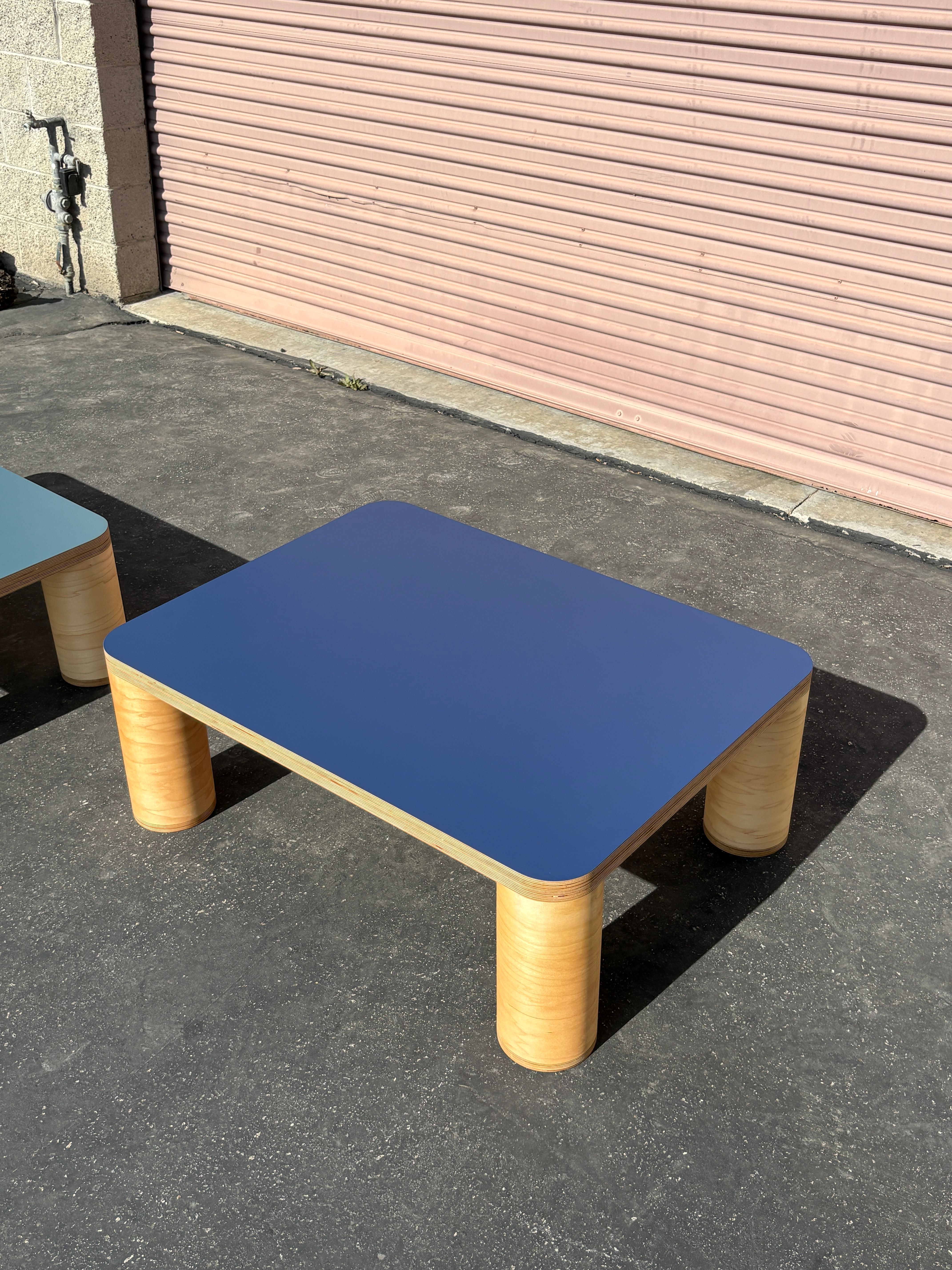 A pair of rectangular coffee tables with four cylinder legs and laminate tops. Navy Blue: 40" x 30" x 14.5" T $1,200 Slate: 42" x 26" x 13" T $1,200