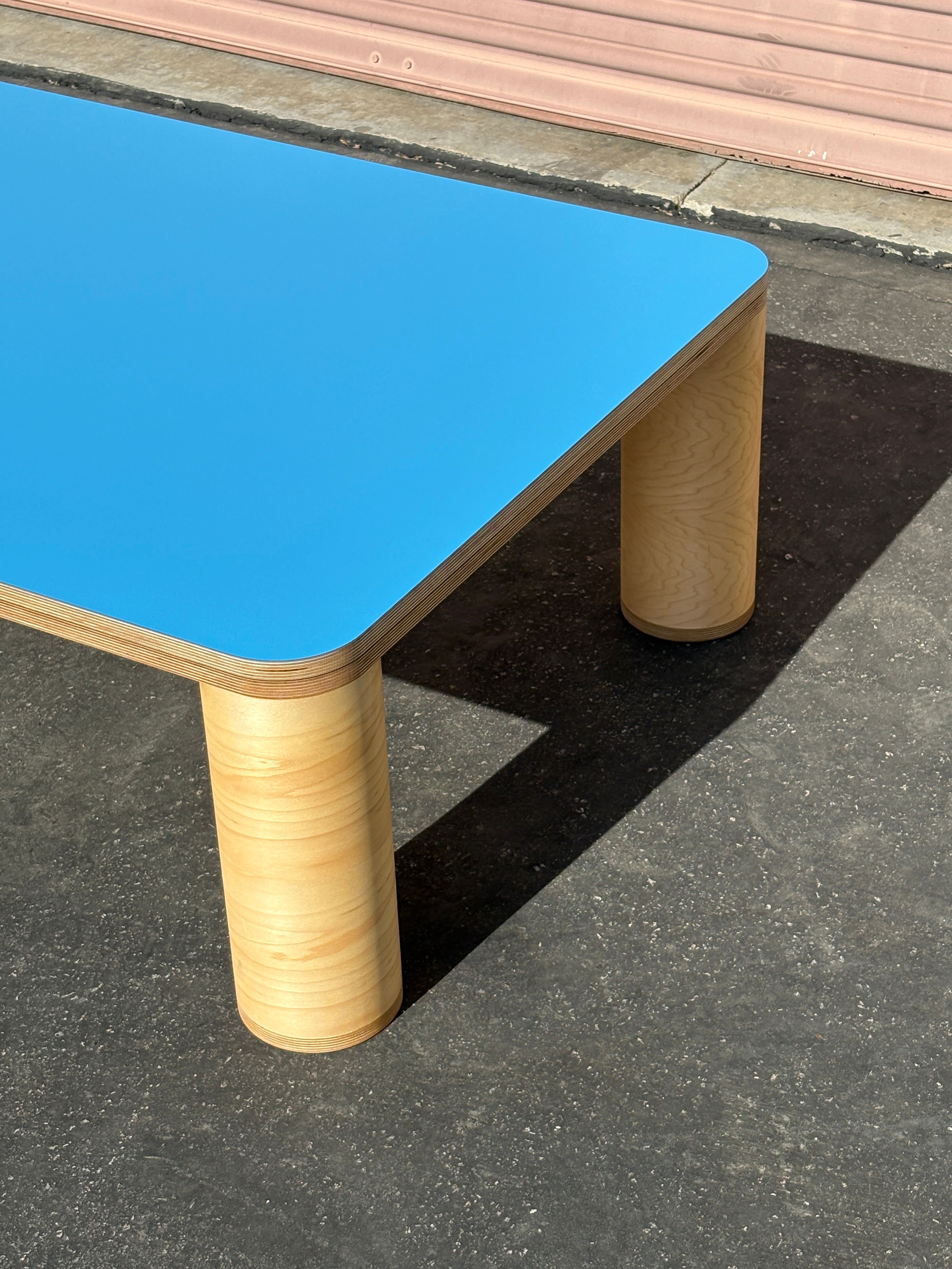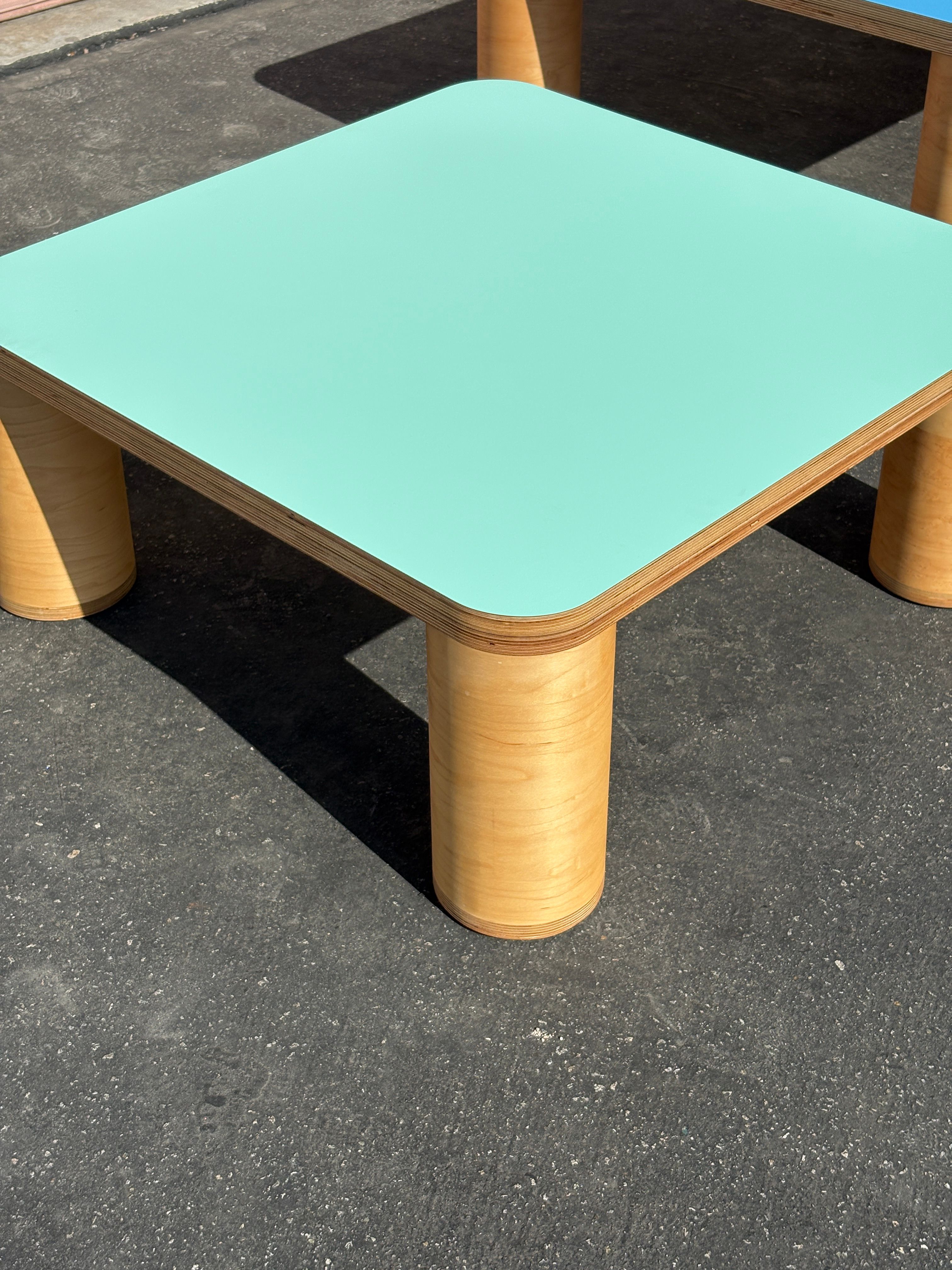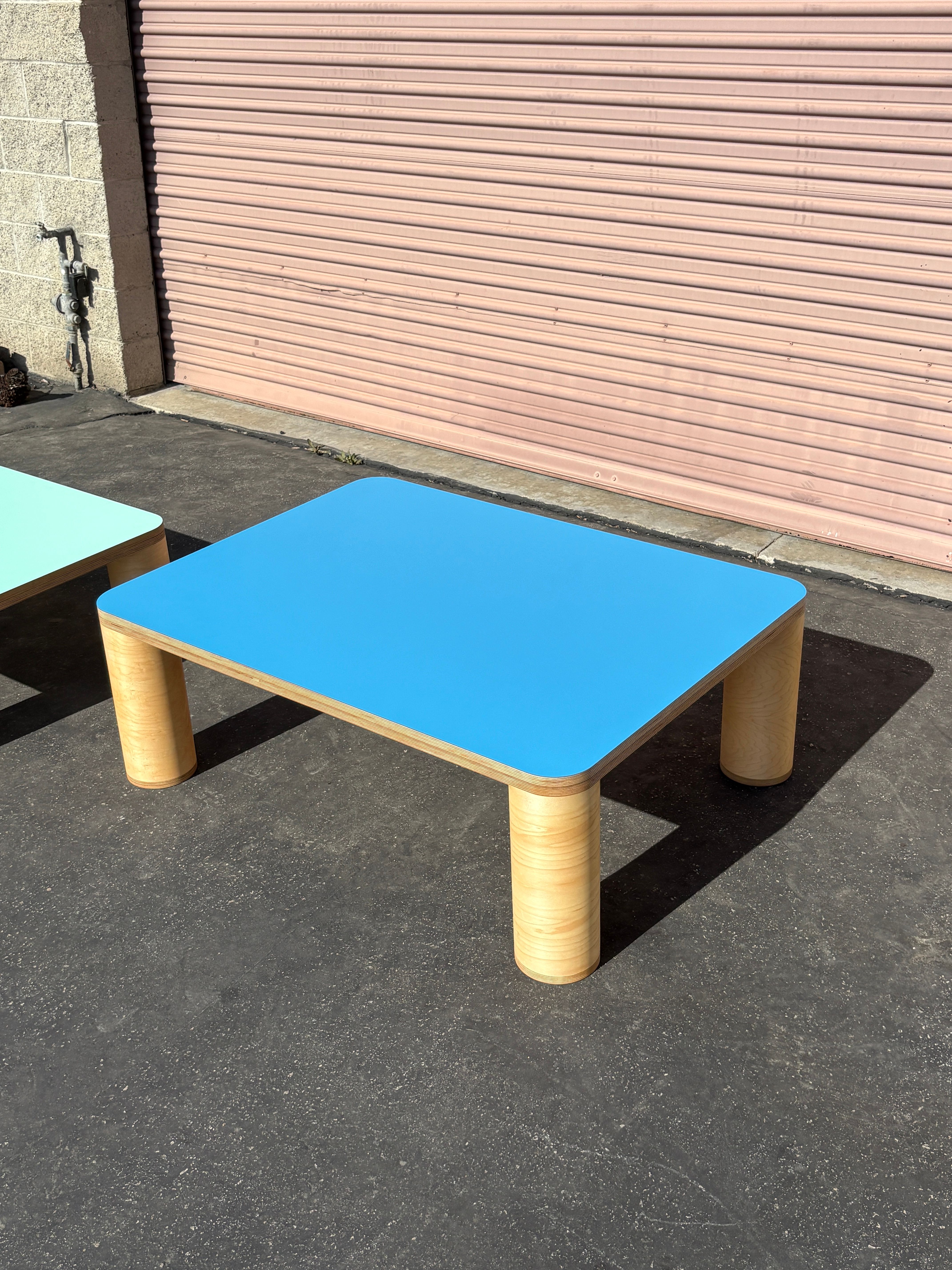 A pair of rectangular coffee tables with four cylinder legs and laminate tops. Sky Blue: 47" x 35" x 16.5" T $1,400 Aquamarine: 32" x 32" x 13" T $800