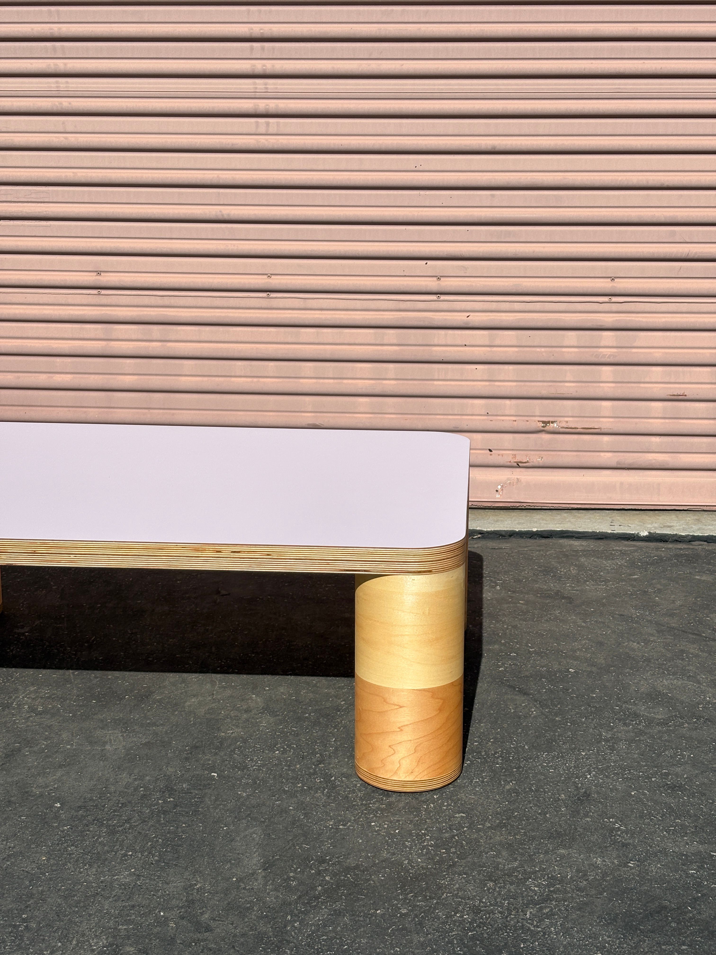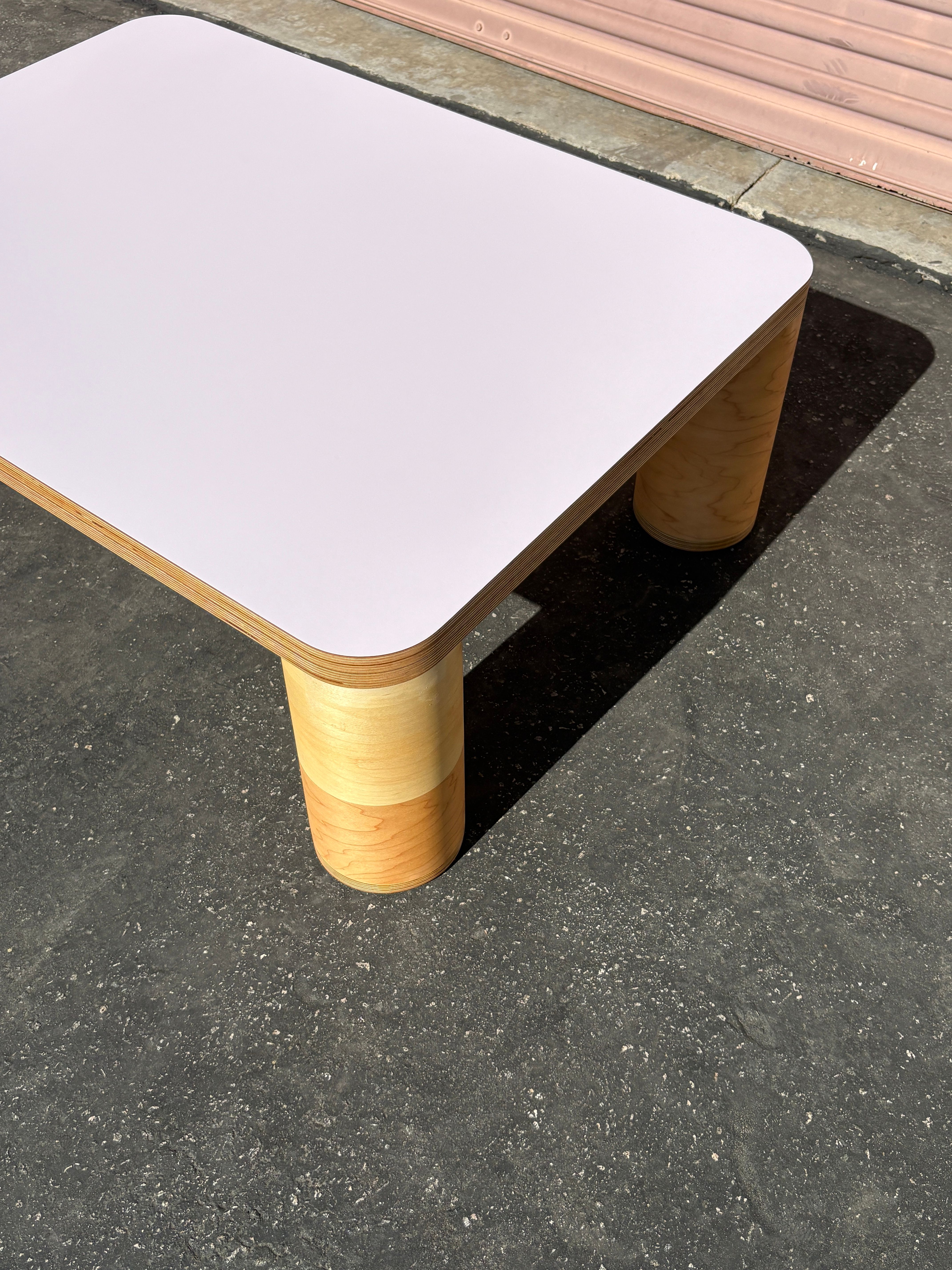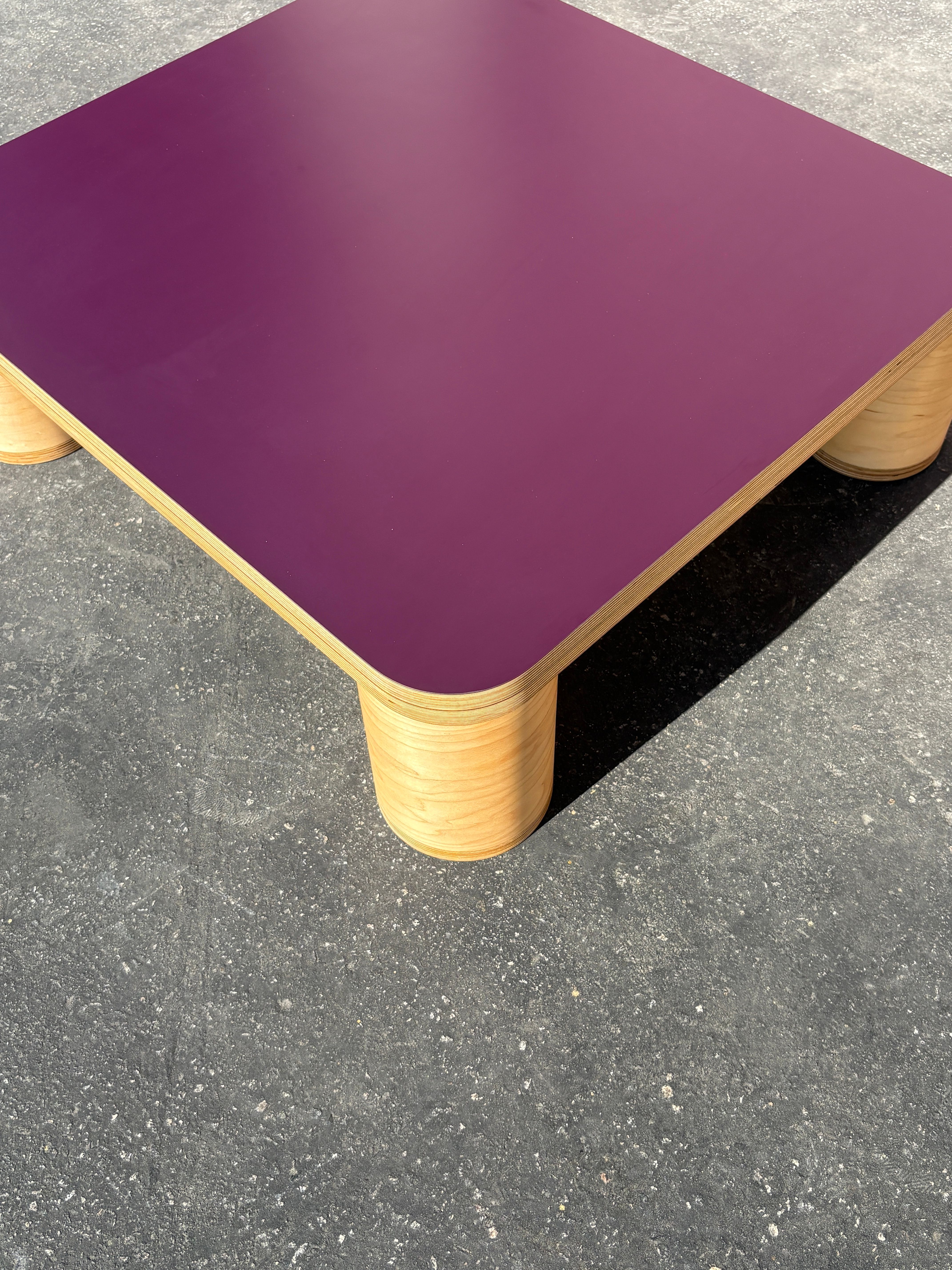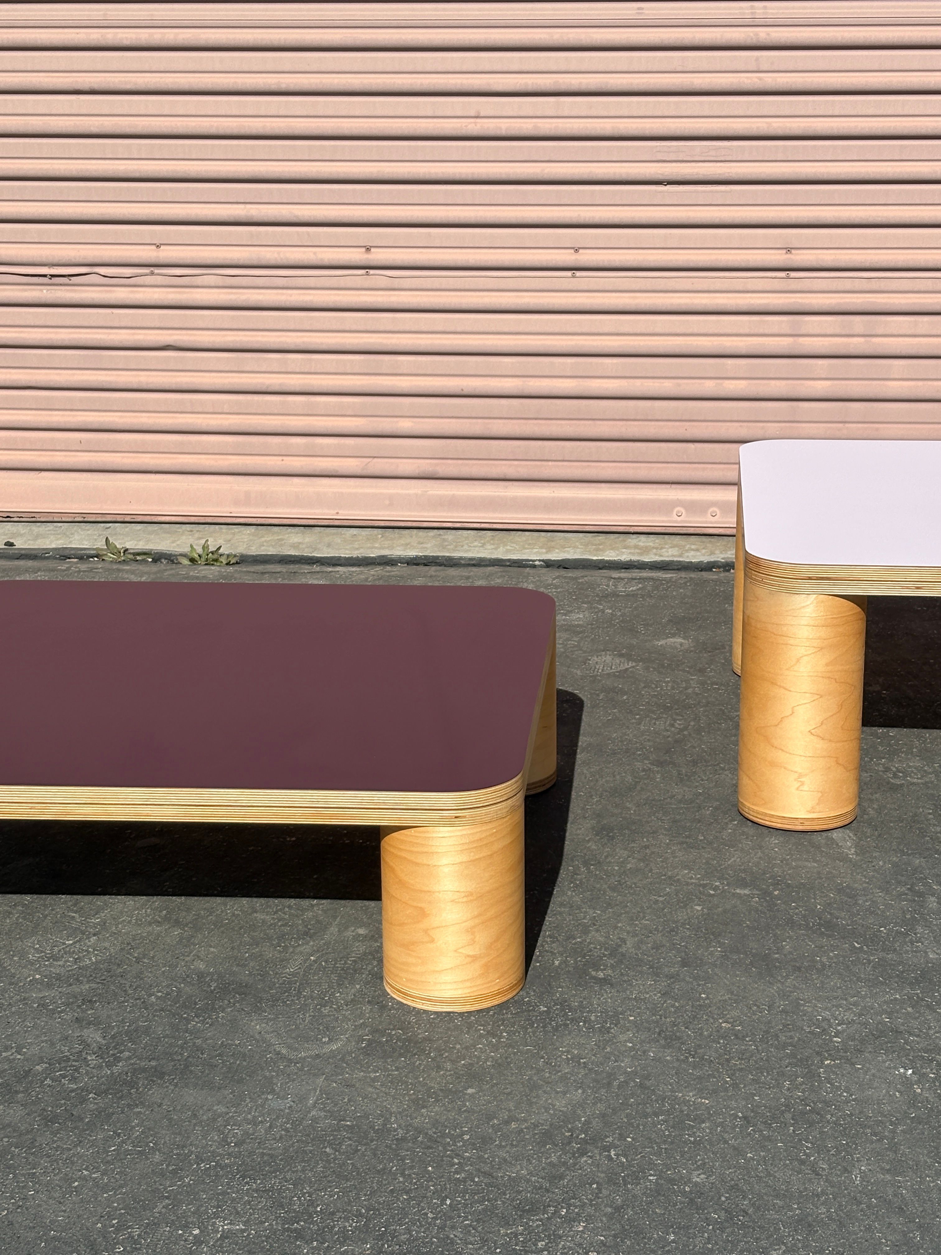 A pair of rectangular coffee tables with four cylinder legs and laminate tops. Lavender: 39.5" x 29" x 14" T $1,200 Eggplant: 32" x 29" x 10" T $800