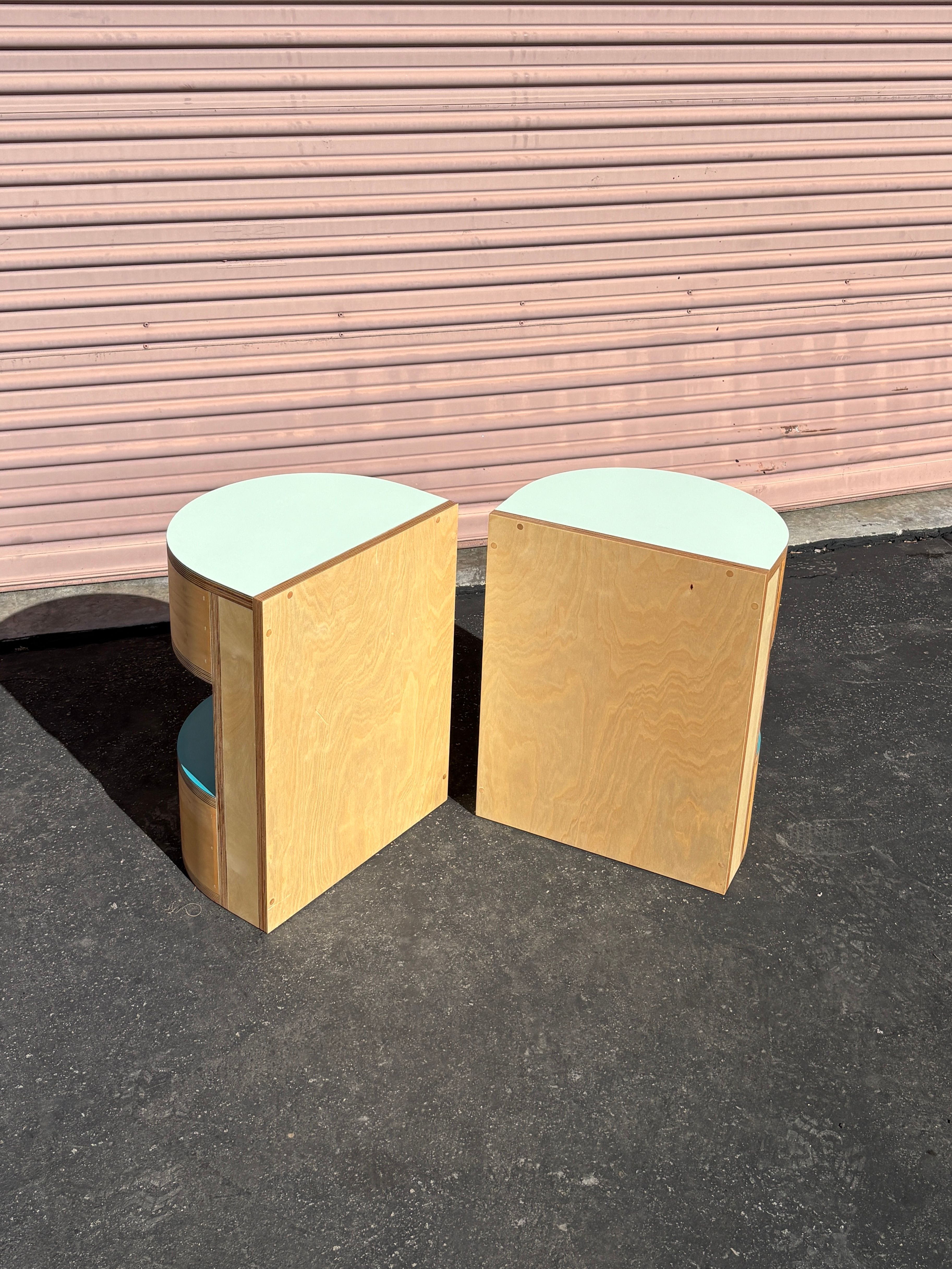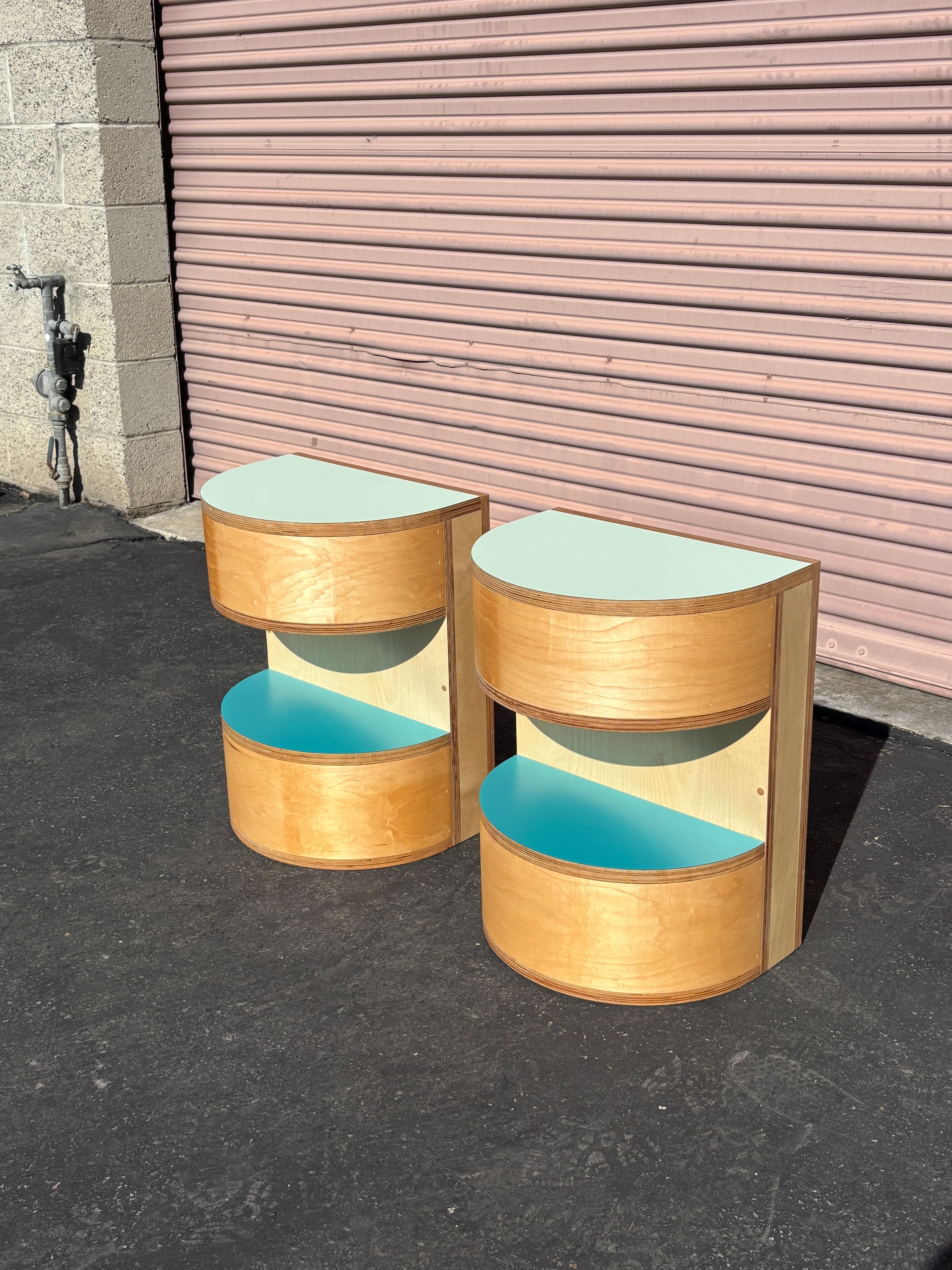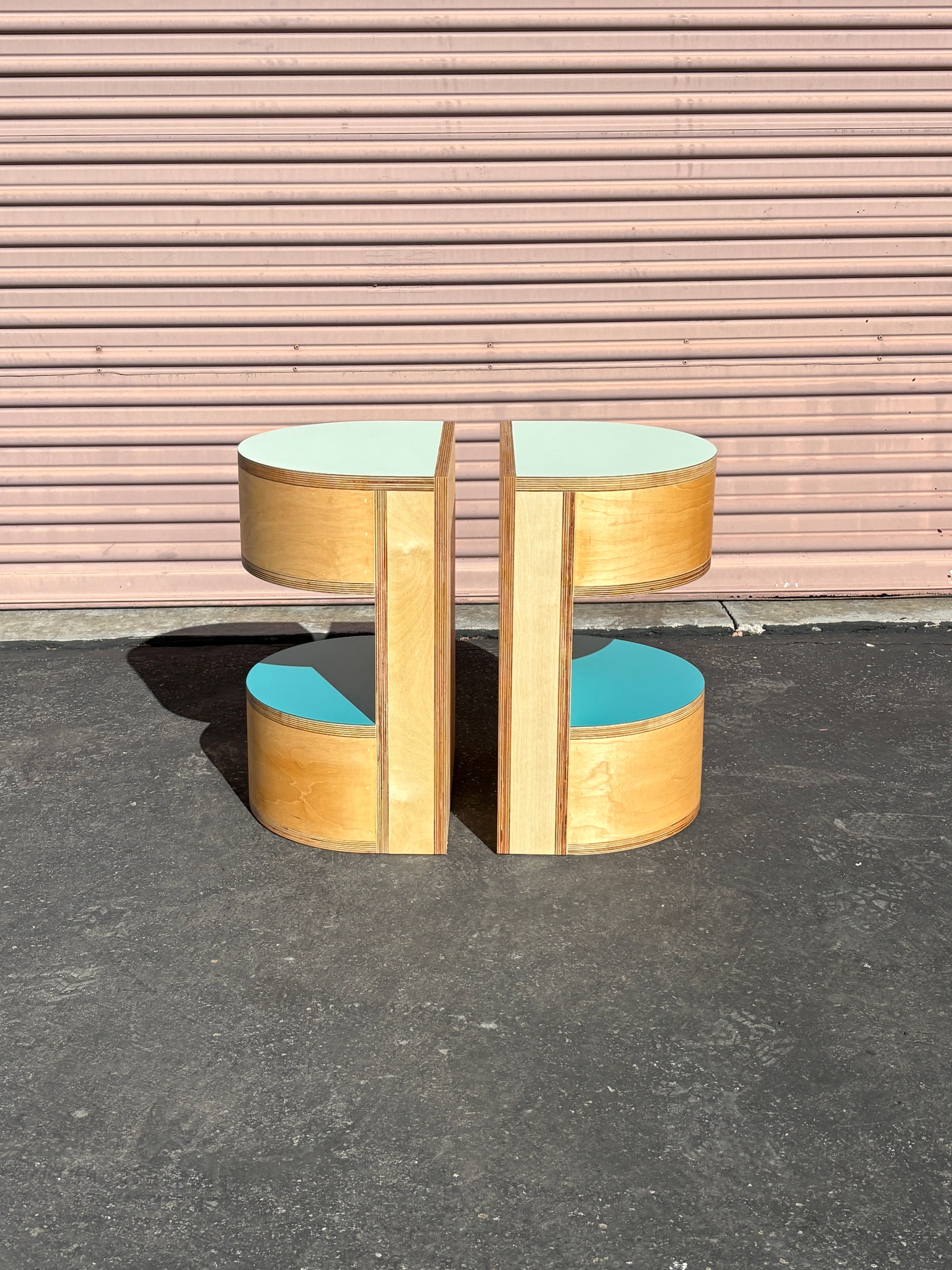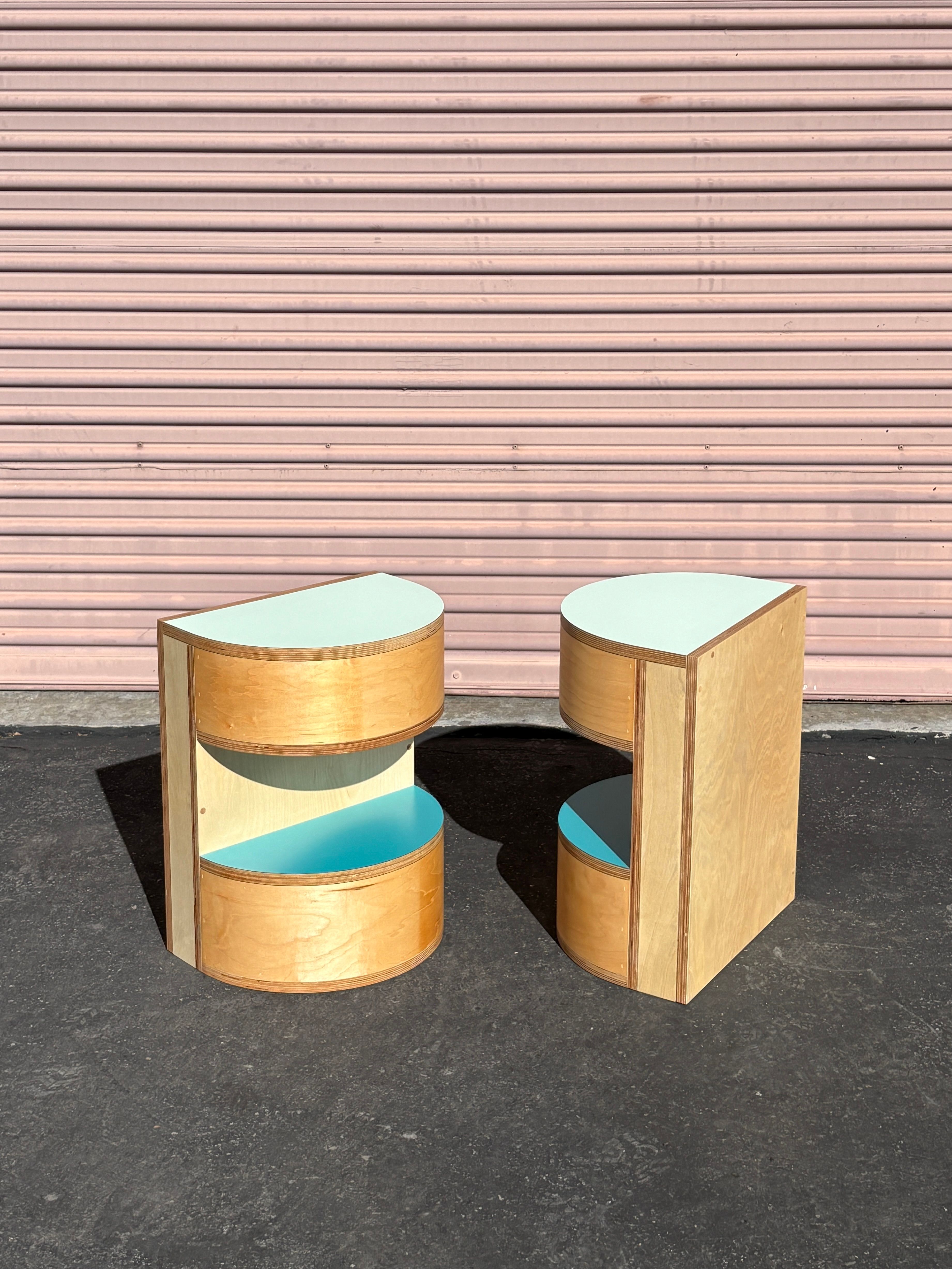 Half round night stands with blue laminate top and natural oil finish. Made in Los Angeles for Charles DeLisle.