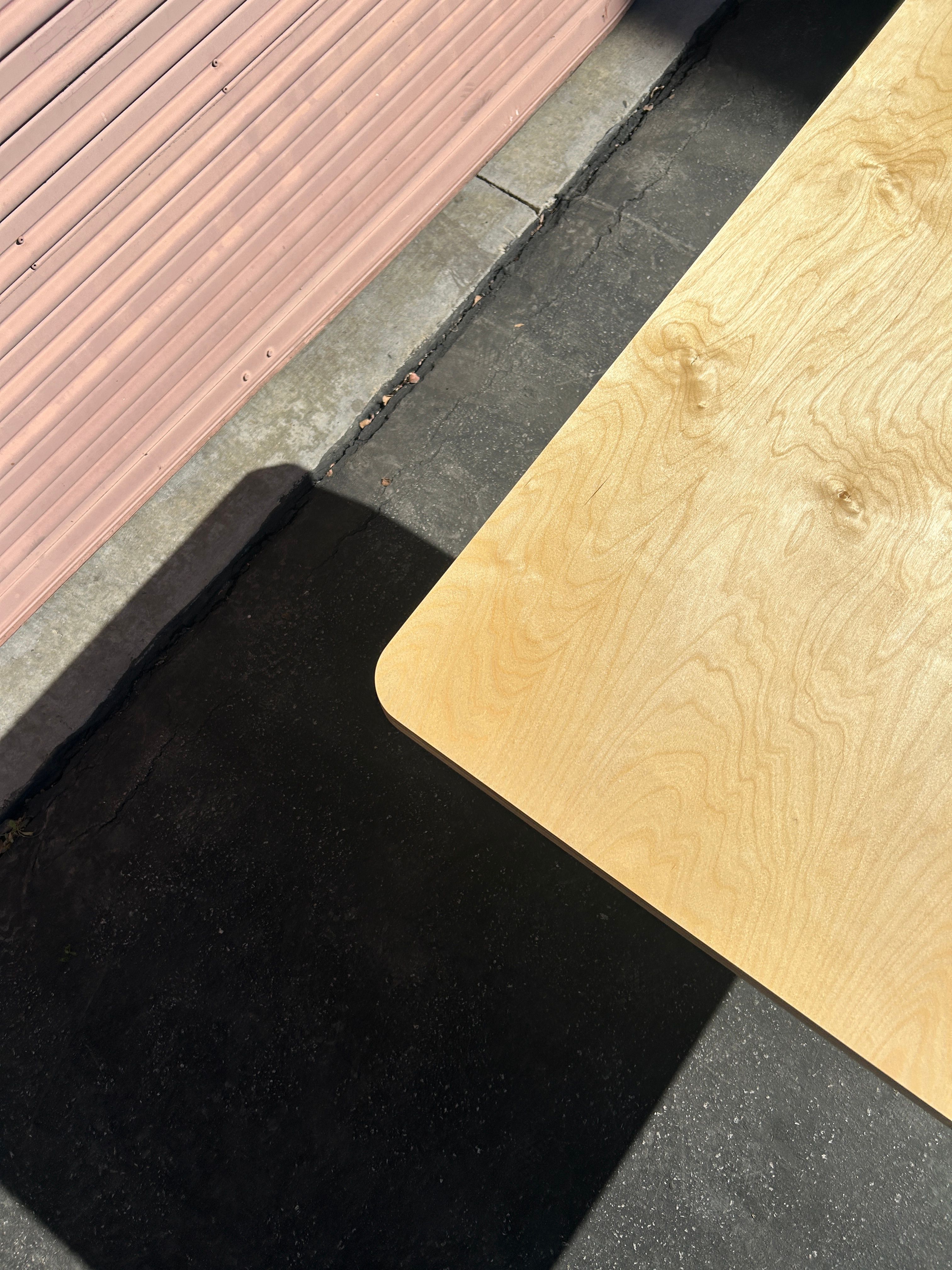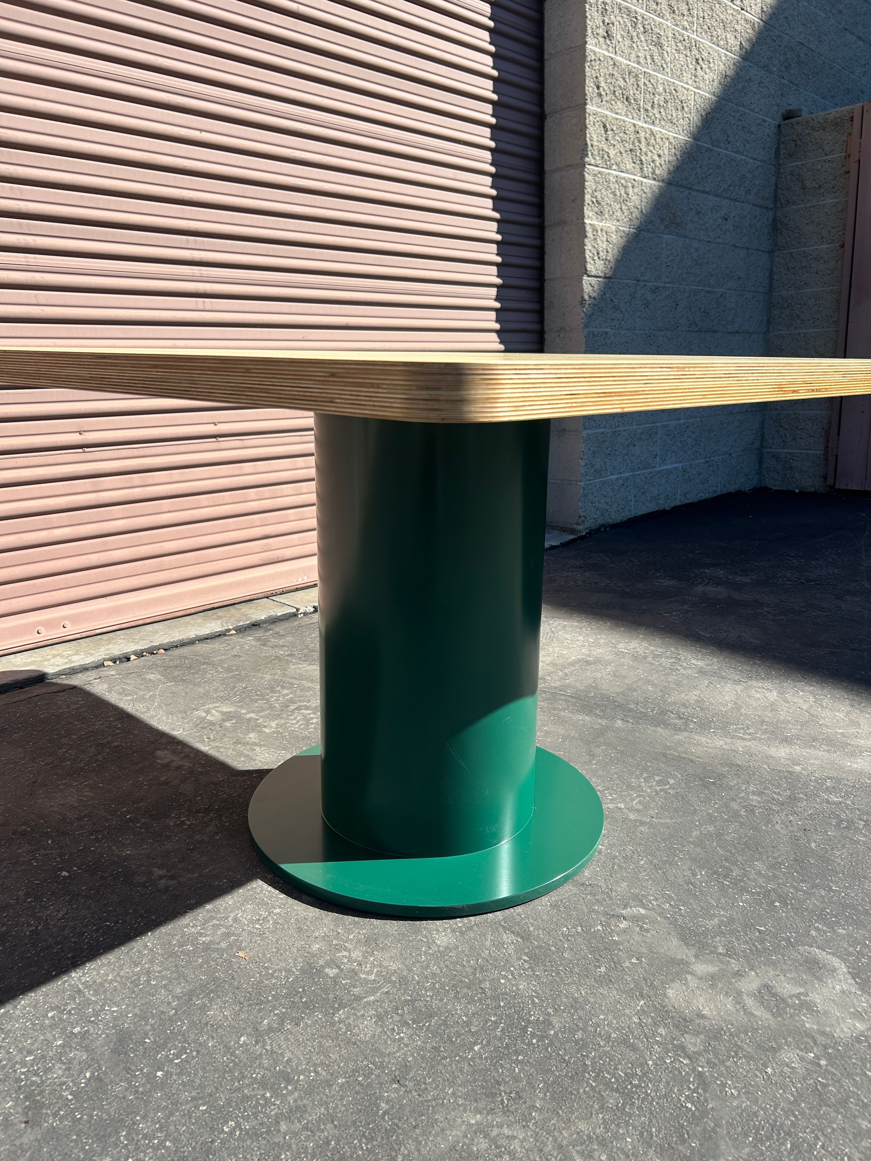 A table with cylinder base with hunter green lacquer finish and a double thickness baltic birch plywood top. Made in Los Angeles for People's Space.