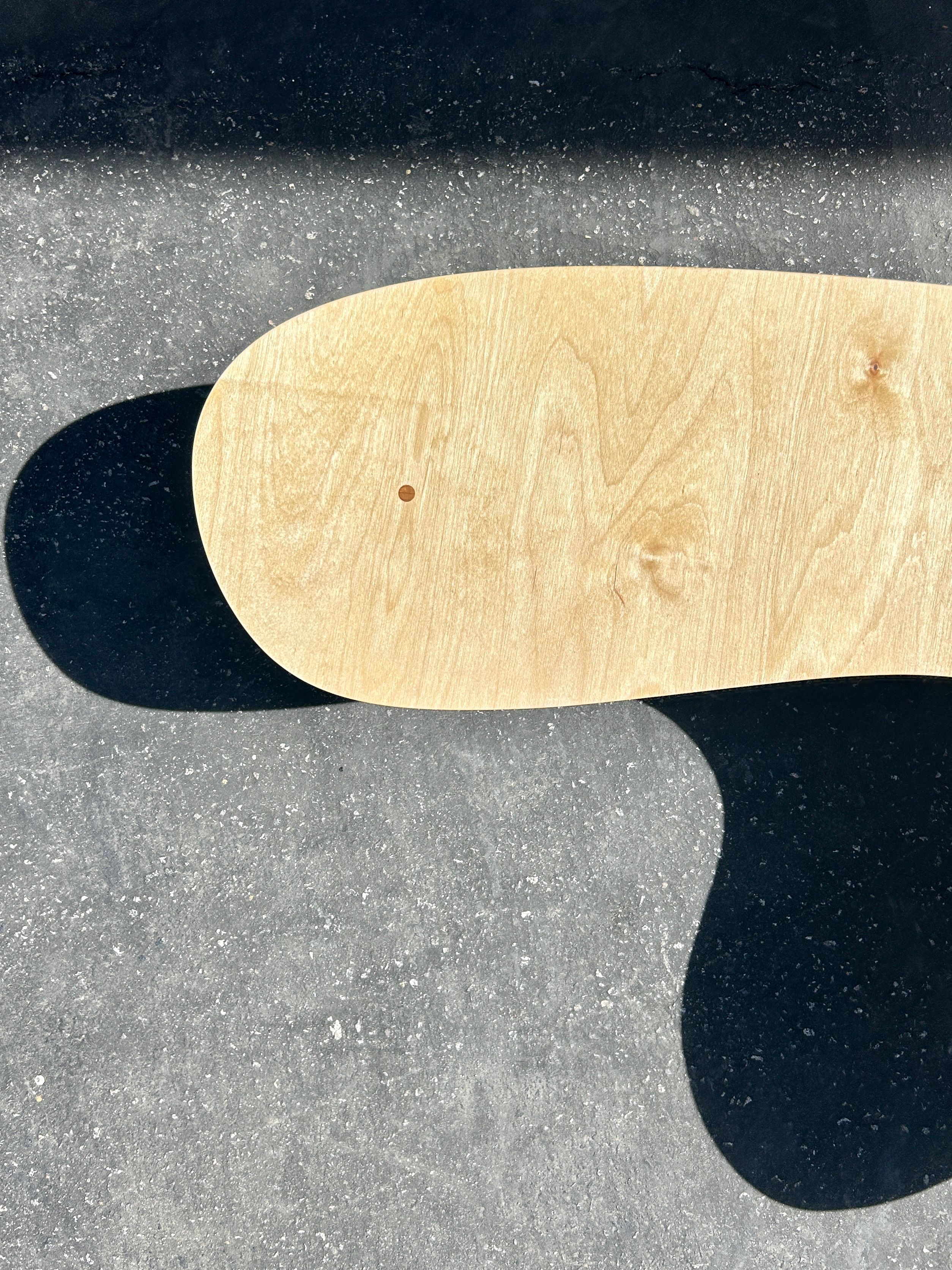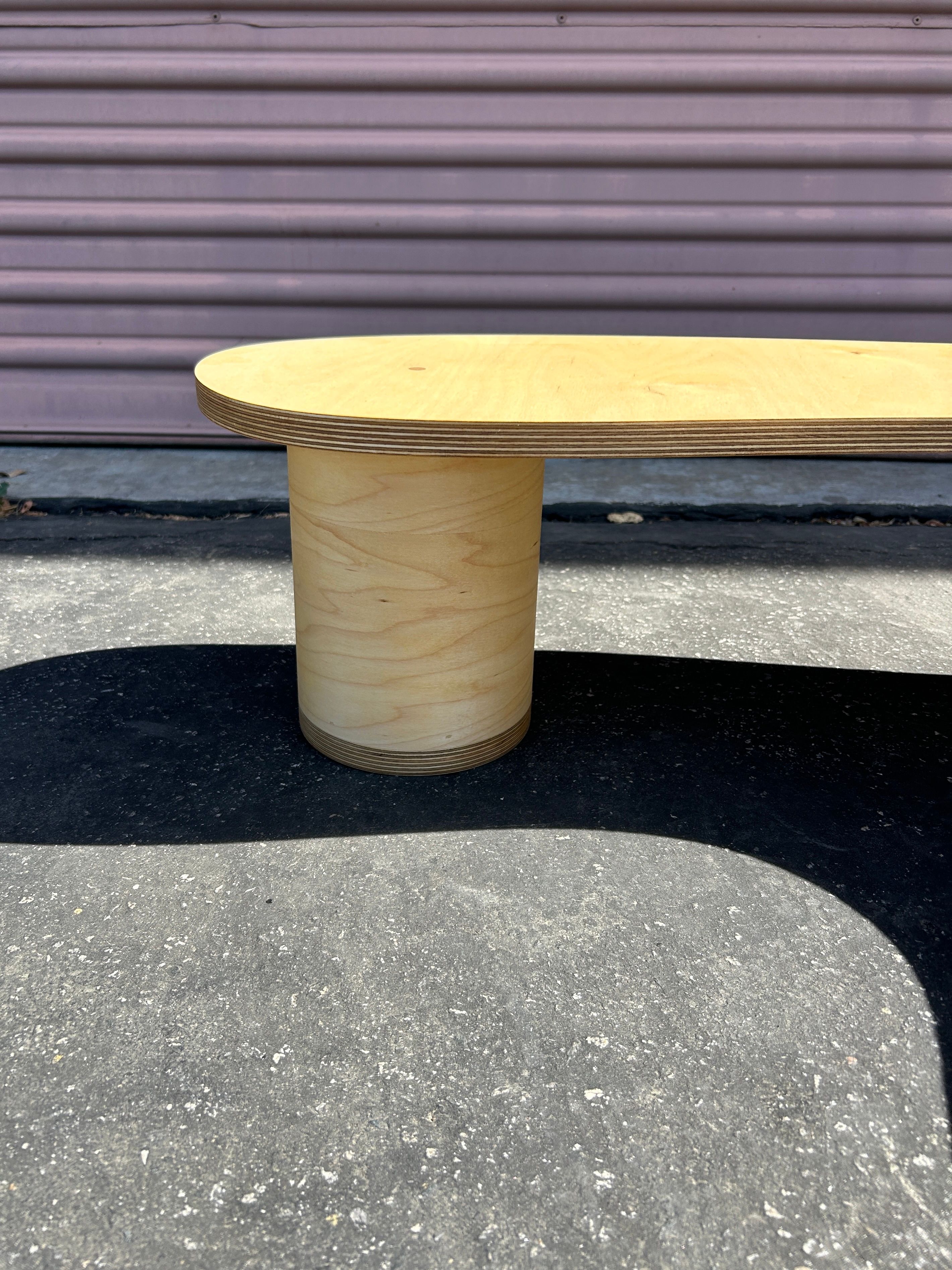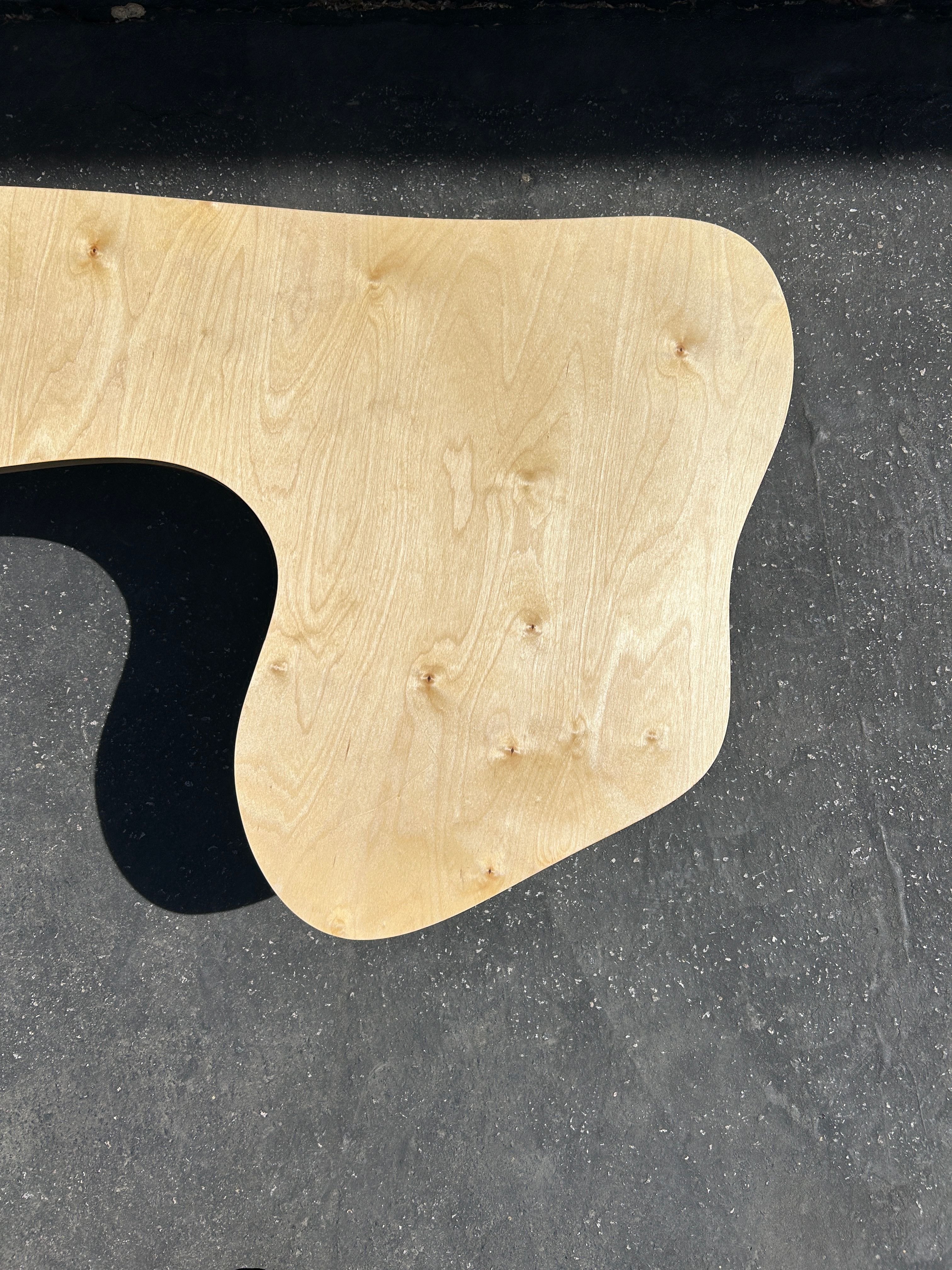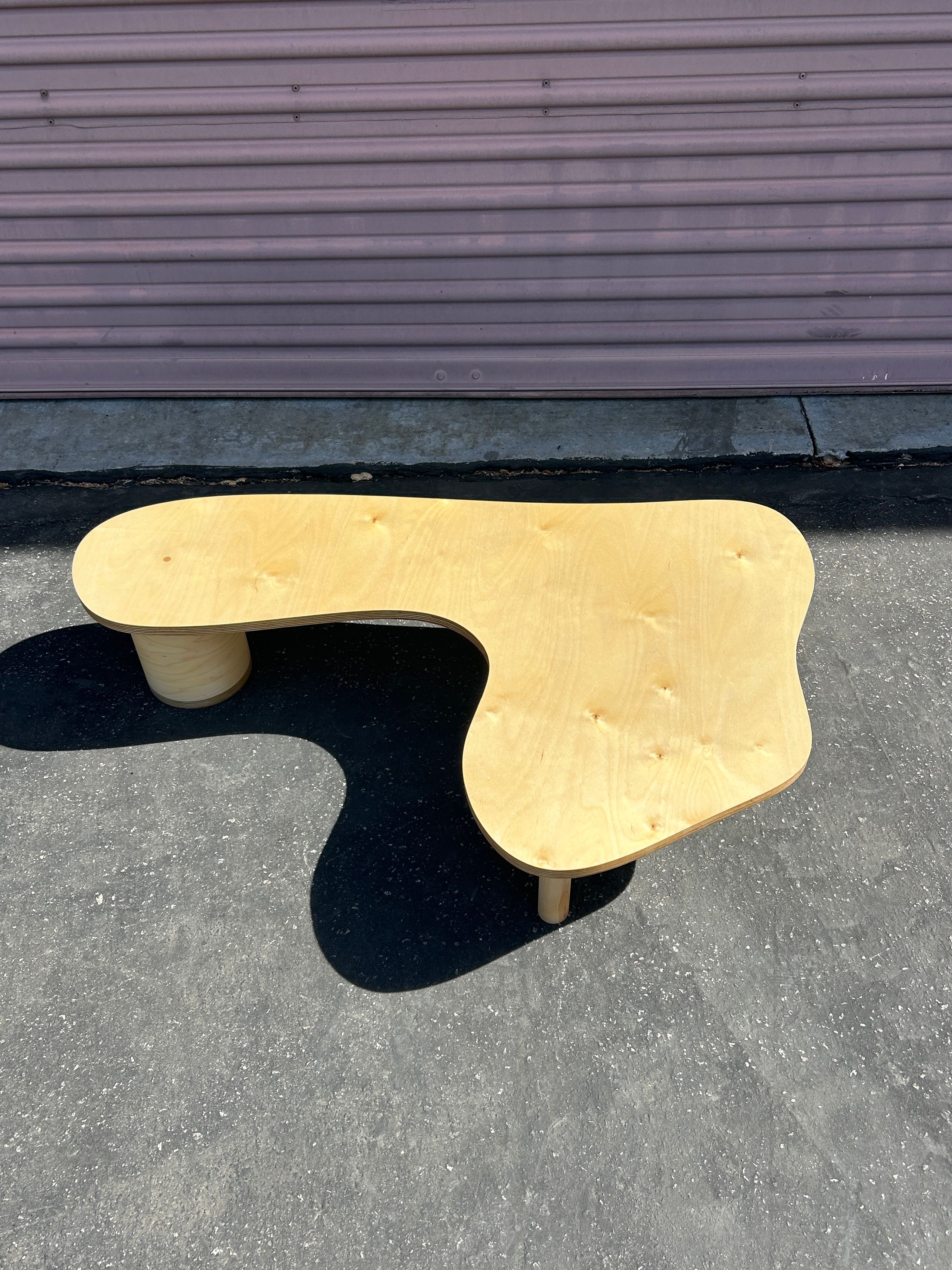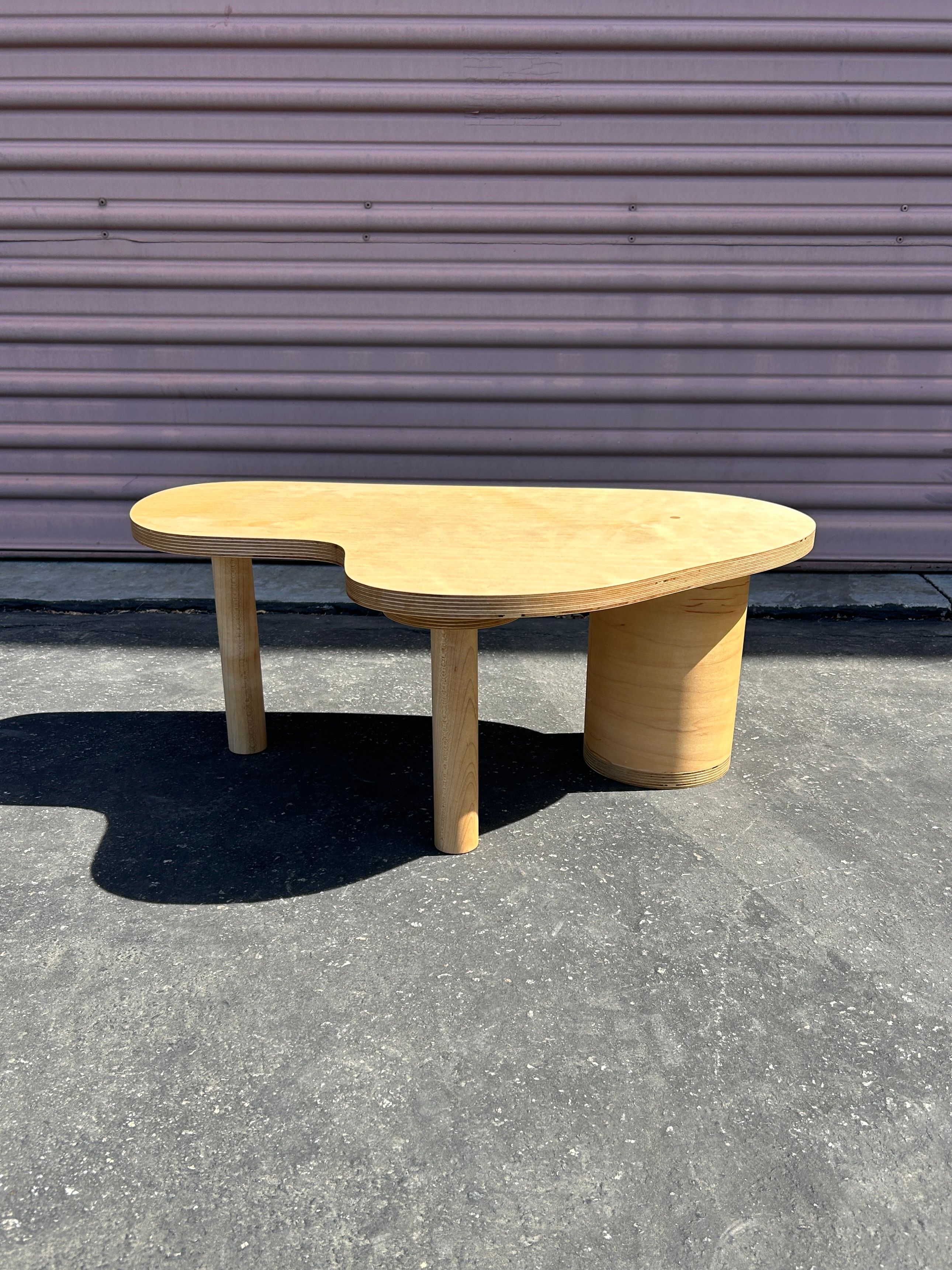 An amorphous puddle shaped coffee or side table, with an assortment of cylindrical legs. Made with baltic birch plywood. $650 Available for custom order after sold out - contact for purchase.