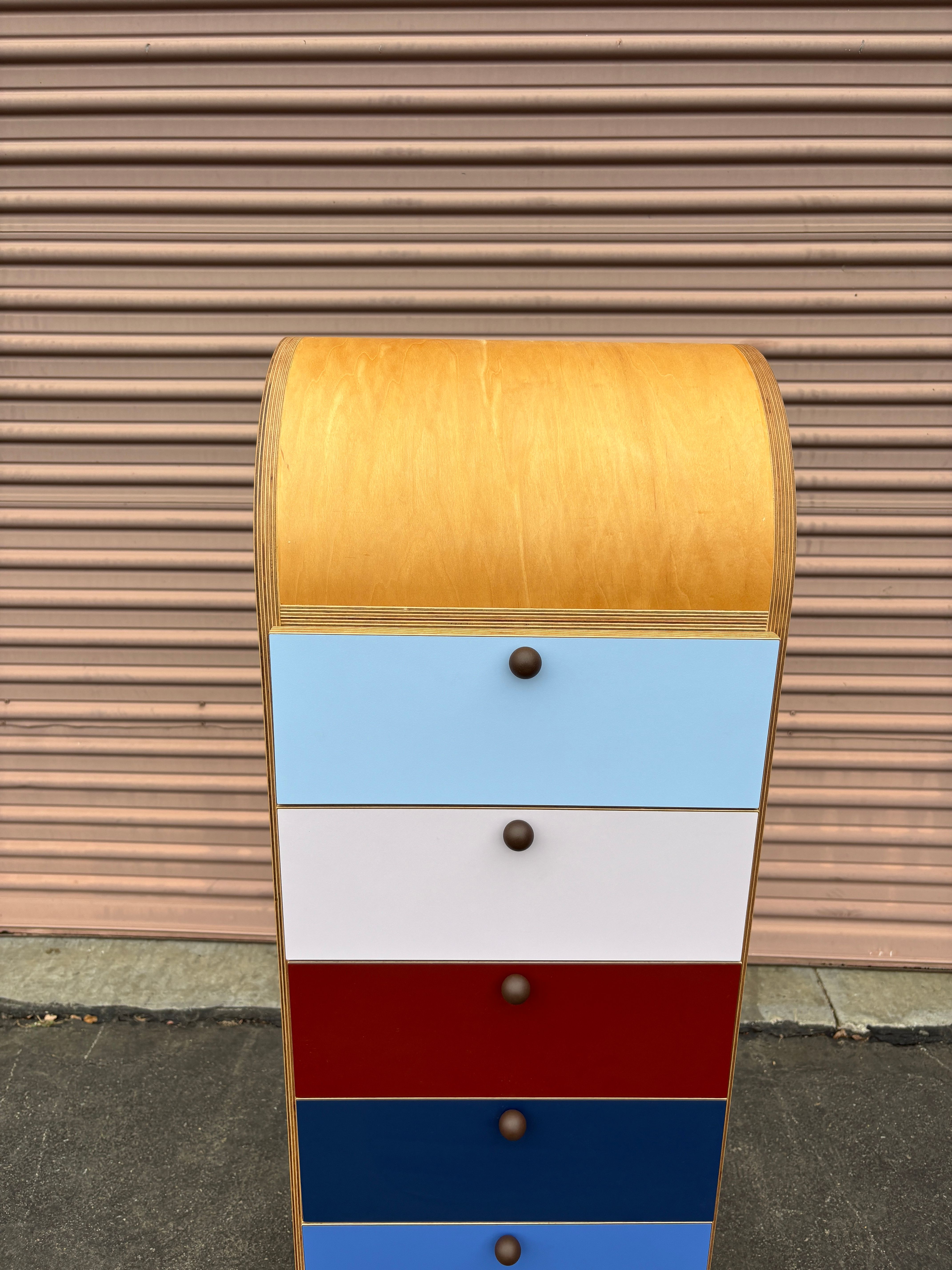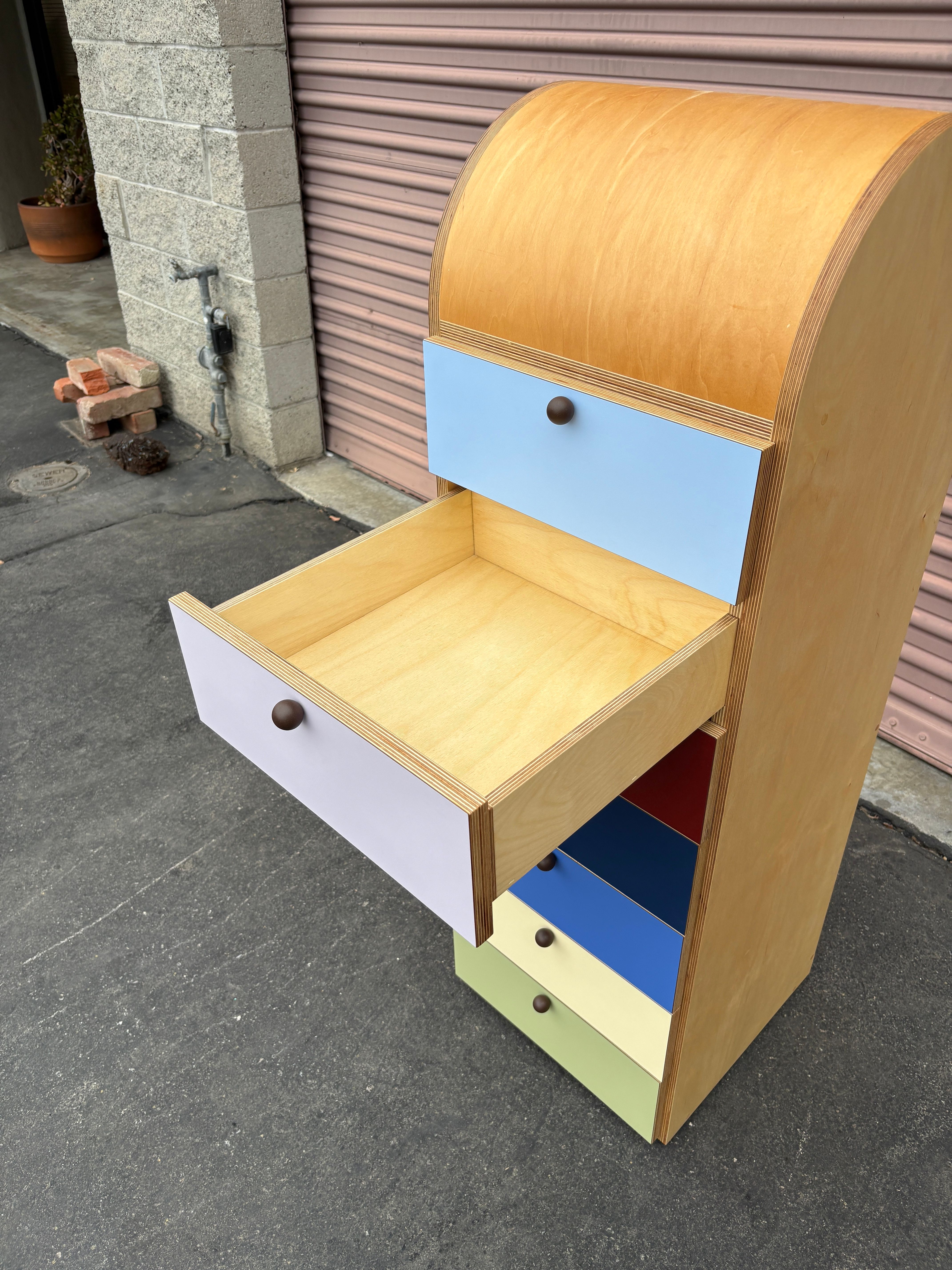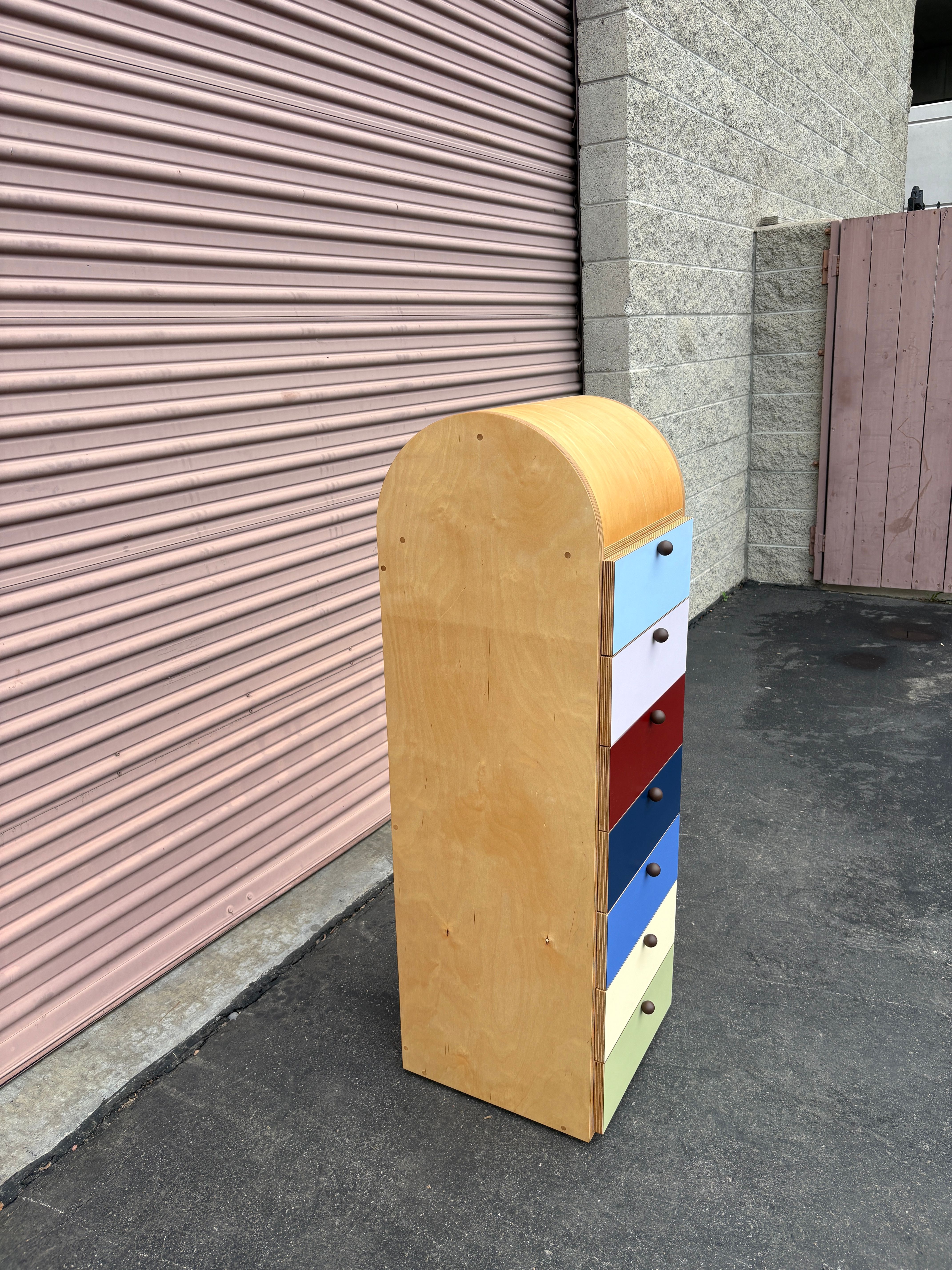 A Tower Chest with half round top, laminate drawer faces, brown powder coated drawer pulls and natural oil finish. Made in Los Angeles for Geremia Designs.